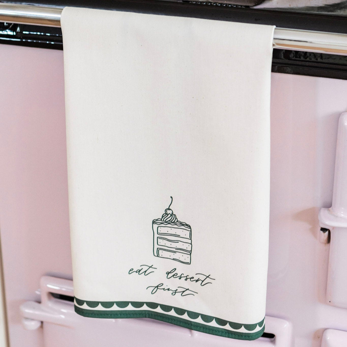 A crisp cotton/linen blend tea towel, screen-printed with the Avalon Home phrases you know and love — now ready to hang from your oven door and your emotional baggage. Finished with a forest green scalloped border, a hanging loop, and a knowing nod to the life of the highly strung host.