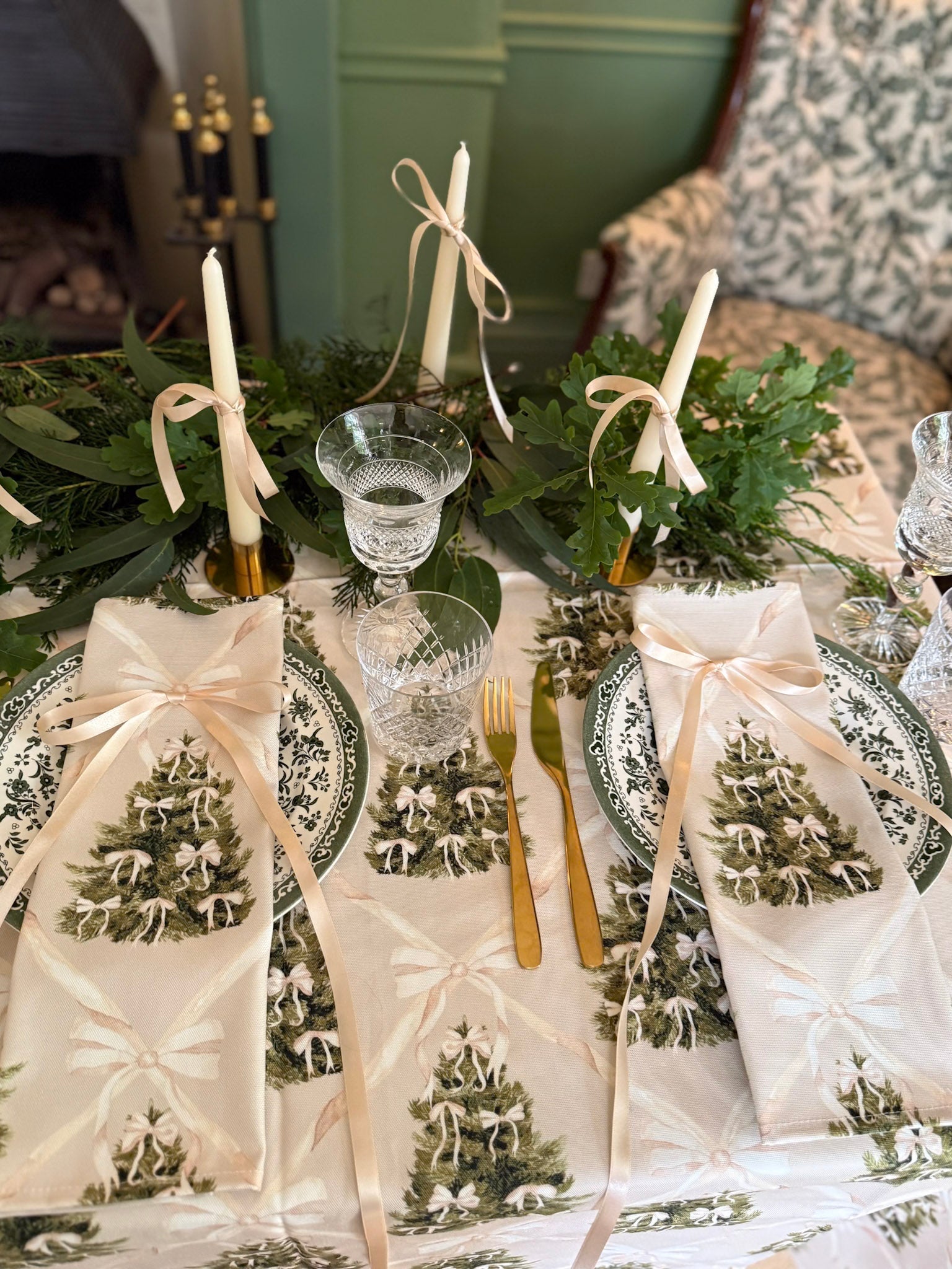 Available as: tablecloths, napkins, runners, tea towels, and oven gloves. Machine washable. Works beautifully with spruce garlands, gold cutlery, and a strict no-drama dress code.
