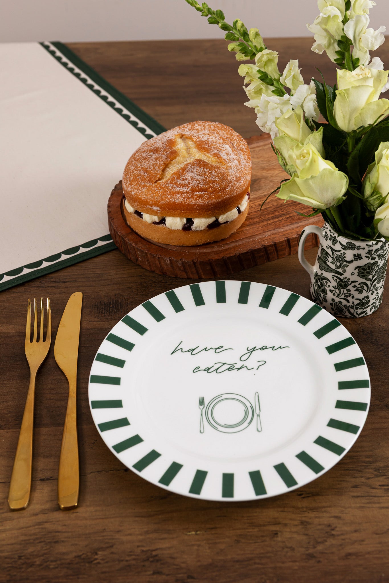 Equal parts warm welcome and watchful eye, our Have You Eaten? dinner plate is made in the traditional way in Stoke-on-Trent and finished with Avalon’s signature green stripe design. This piece of British made tableware makes a thoughtful addition to your collection, serving up a question every guest should be asked as soon as they step through the door.