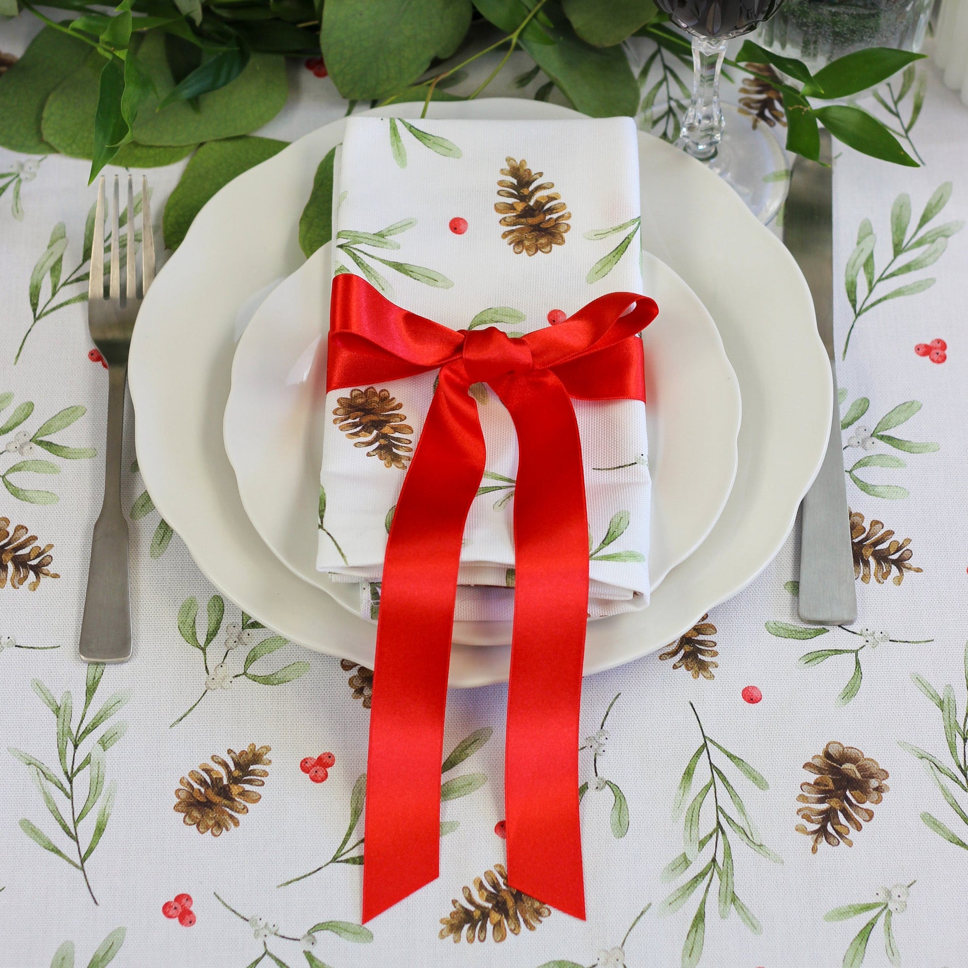 Available as: tablecloths, napkins, runners, tea towels, and oven gloves. Machine washable. Style with red ribbon, glass candlesticks, and a sense of quiet relief.