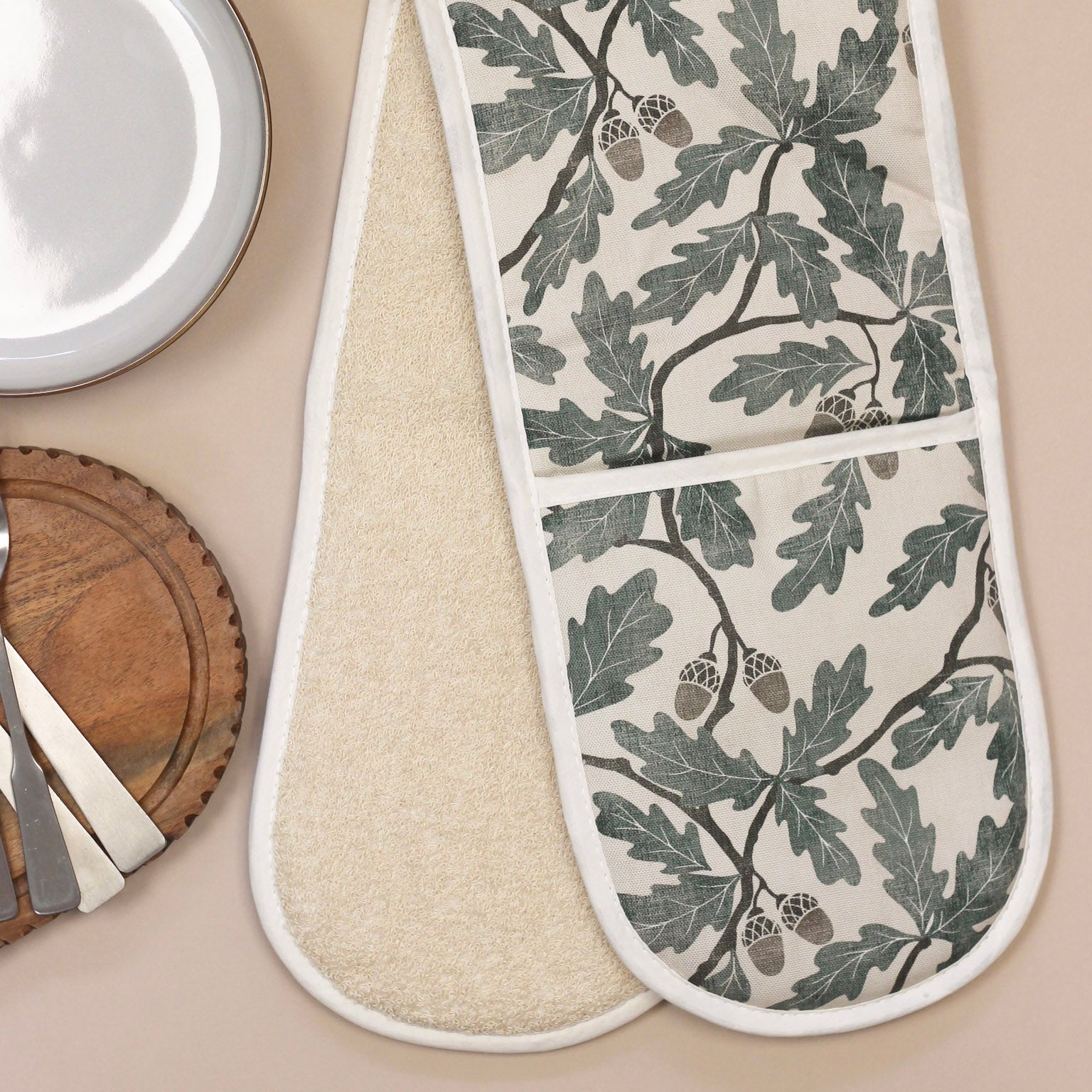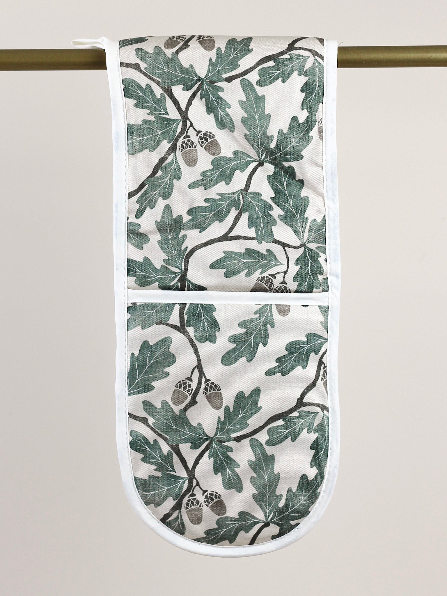 A quietly spectacular print for those who prefer their festivities grounded in nature and rooted in tradition. Our English Oak design captures the noble silhouette of oak leaves and the sculptural curve of acorns in a rich sage green, trailing across crisp white cotton like branches across a winter sky.