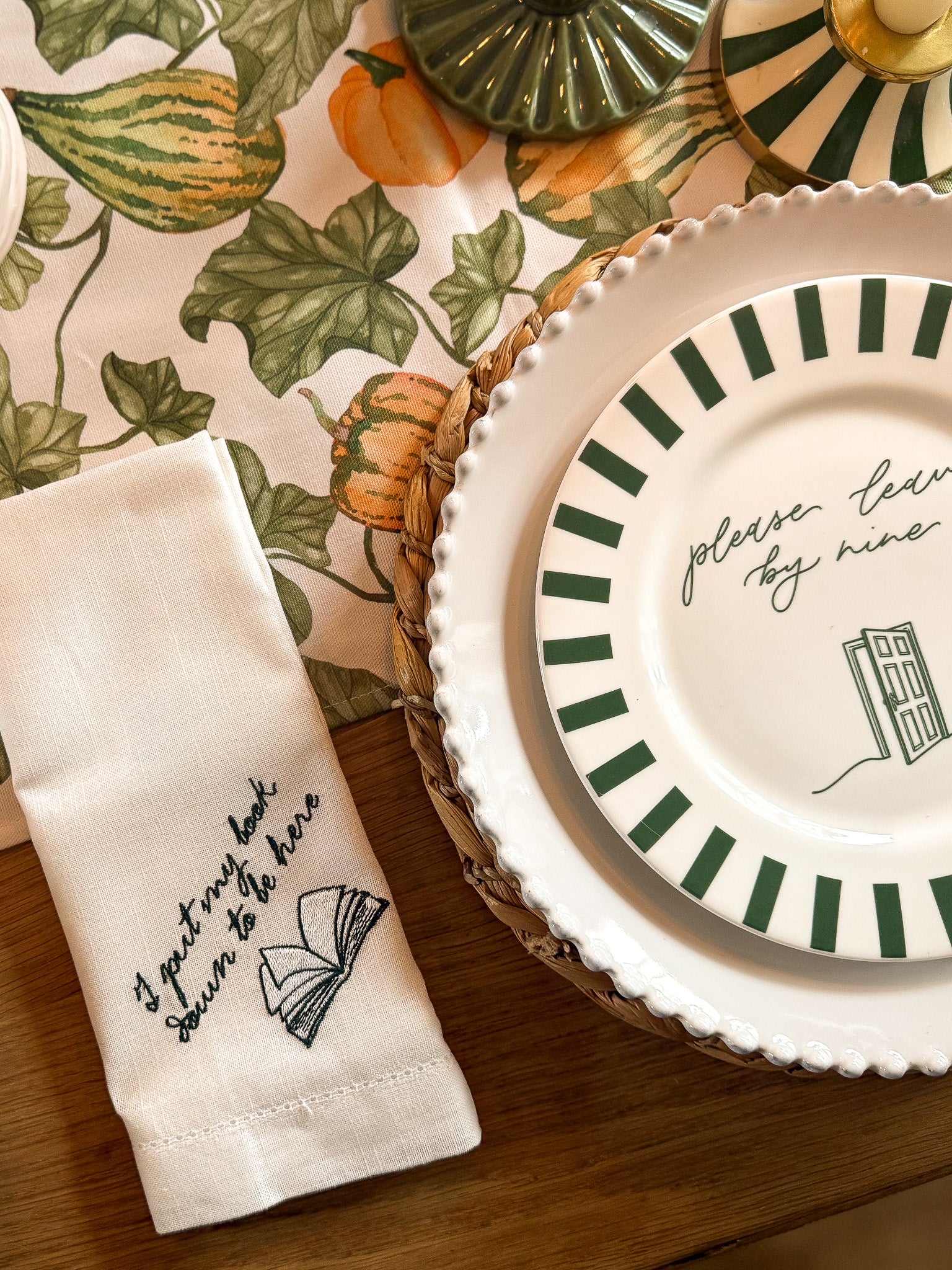 A plate that knows when the party should end. Our Please Leave by Nine dinner plate combines timeless British design with a knowing wink, featuring a crisp green striped border and a playful message at its centre. Hand-crafted in Stoke-on-Trent, the home of fine English ceramics, it’s a dinner party essential for hosts who like to serve up good food alongside gentle hints. Pair it with your favourite Avalon Home napkins for a table setting that’s both elegant and ever-so-slightly cheeky.