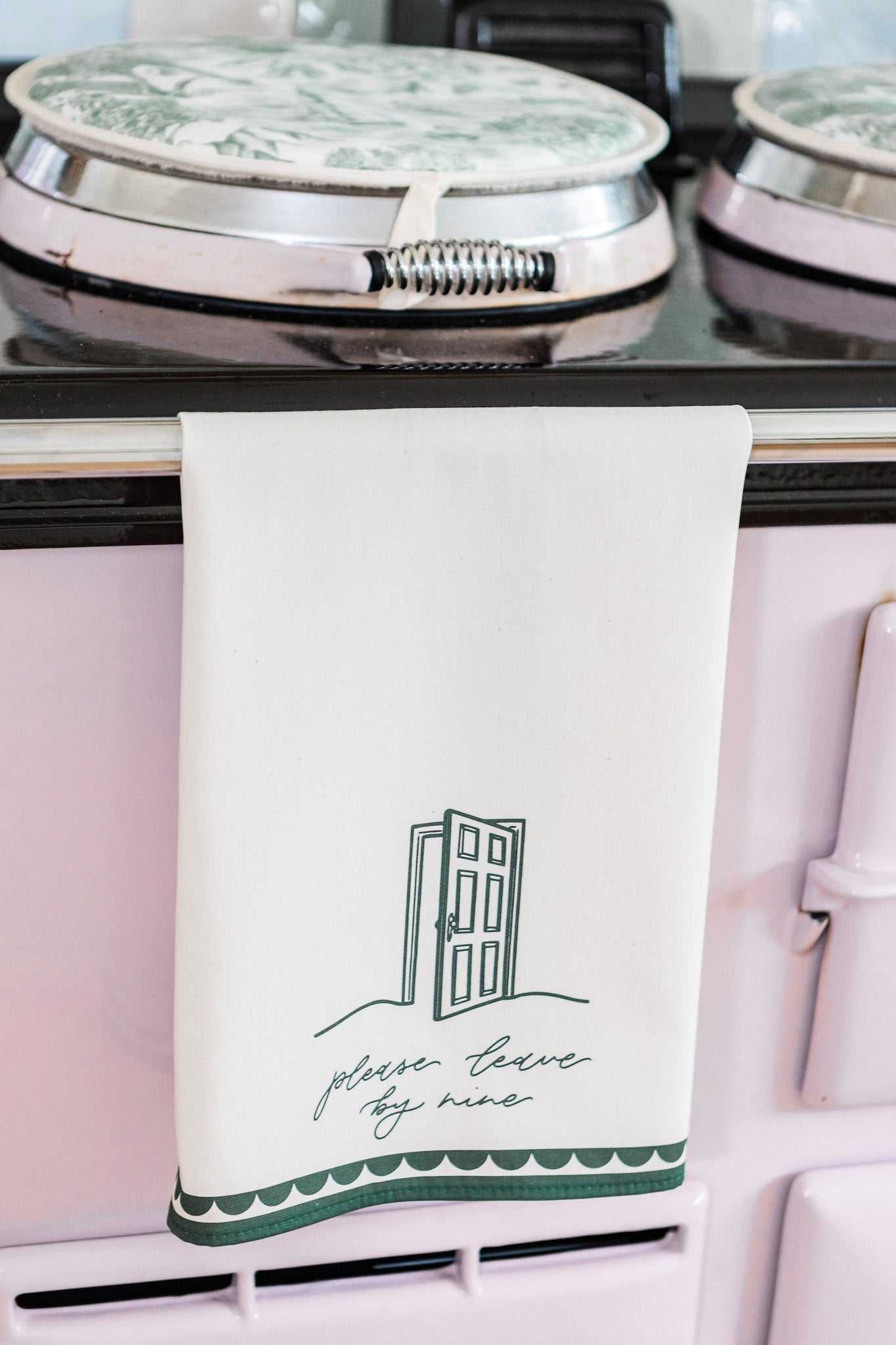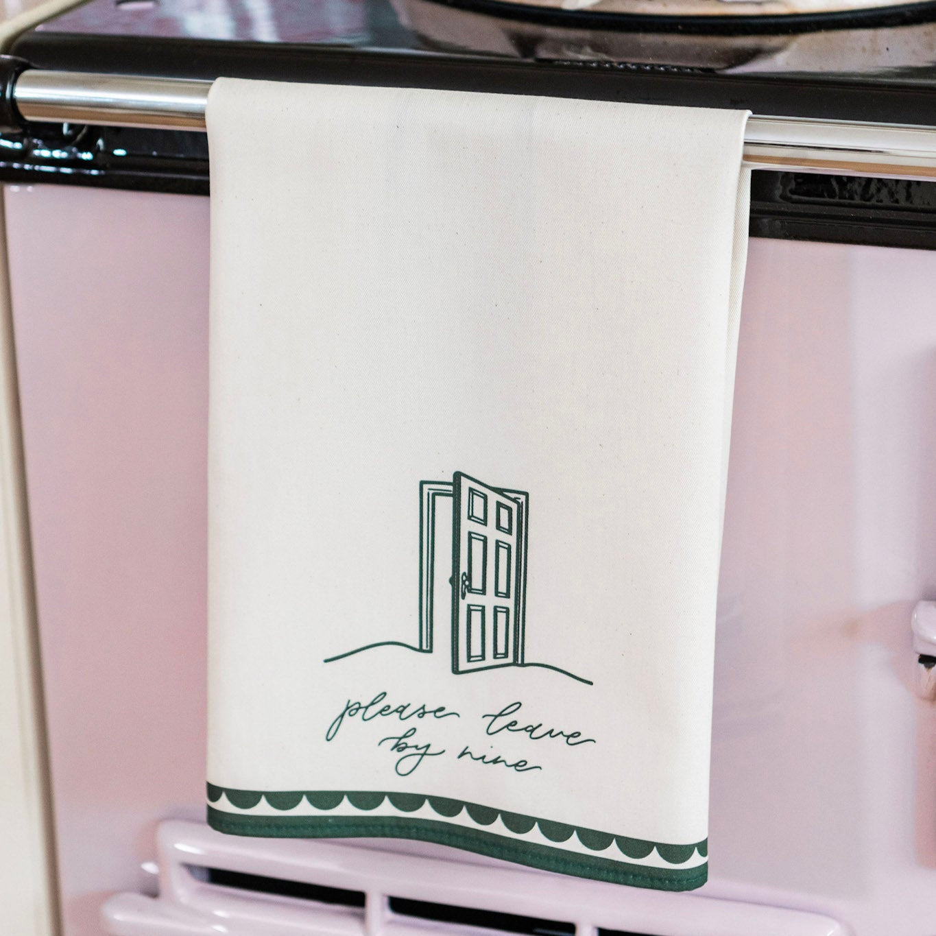 A crisp cotton/linen blend tea towel, screen-printed with the Avalon Home phrases you know and love — now ready to hang from your oven door and your emotional baggage. Finished with a forest green scalloped border, a hanging loop, and a knowing nod to the life of the highly strung host.